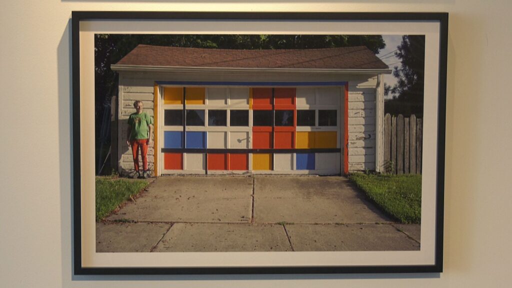 To promote the exhibition, Graham had the piece shown below put on a local billboard last month. The image depicts the garage of his neighbor, who painted it in the style of artist Piet Mondrian.