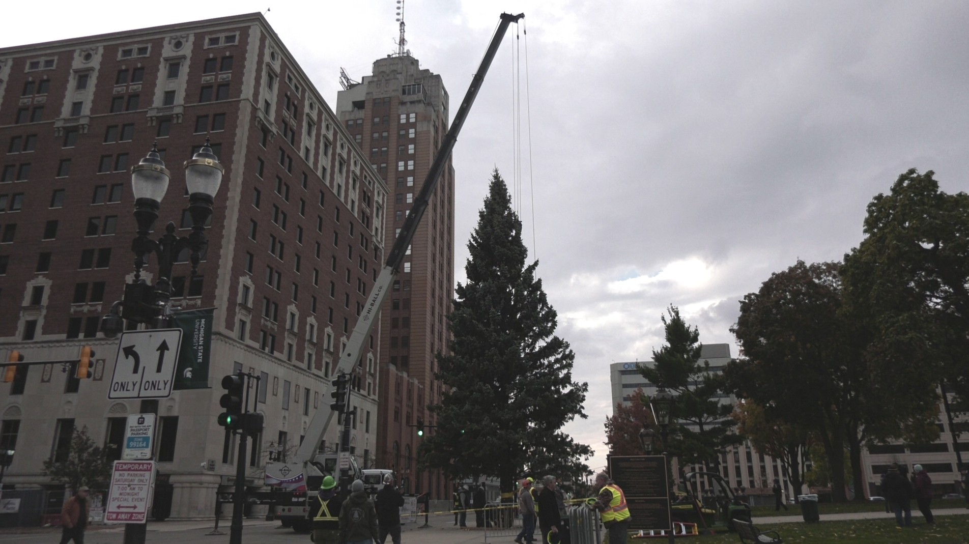 After arriving in Lansing, the Boy Scouts helped remove the restraints around the branches before the tree was lifted into place. In the coming days, the Lansing Forestry Division will shape and secure it before the Board of Water and Light adds thousands of twinkling lights.