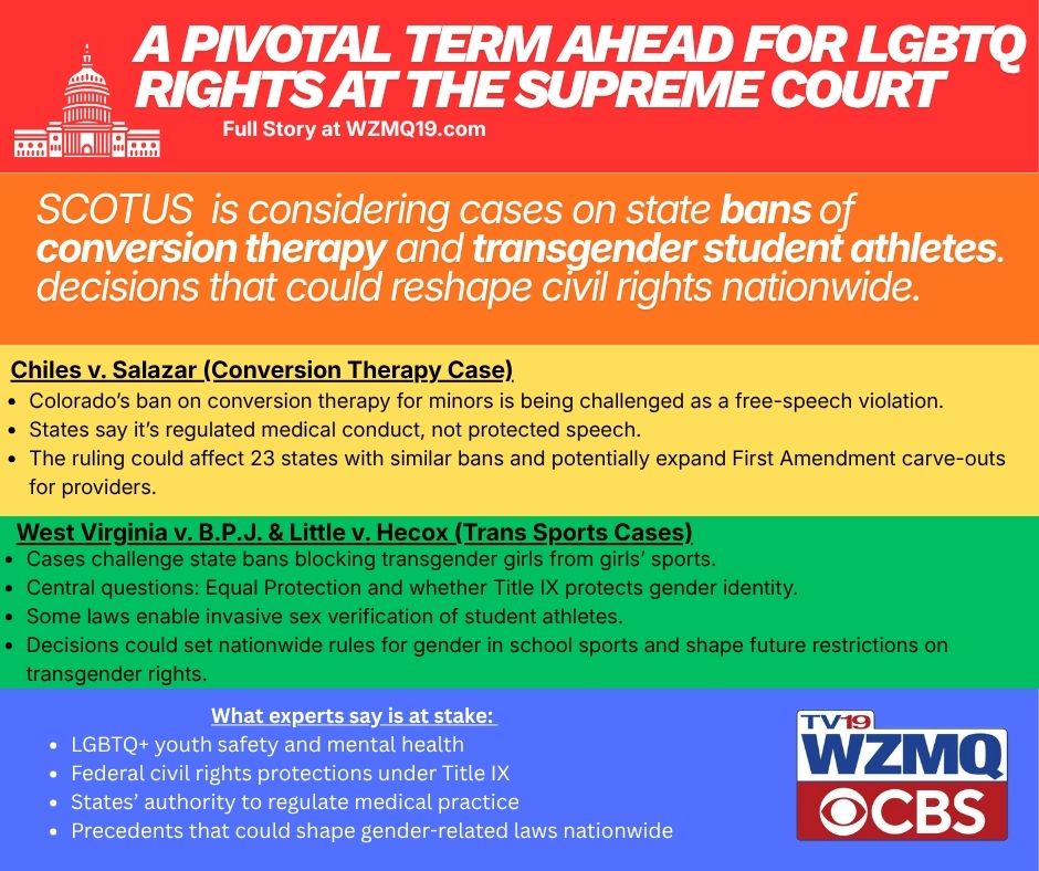 LANSING, Mich. (WZMQ) – The U.S. Supreme Court is preparing to hear two cases that legal scholars say could become landmark rulings for LGBTQ+ rights. The first is on transgender participation in school sports, and another is testing whether states can ban conversion therapy for minors.