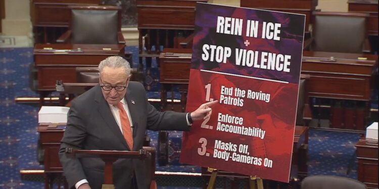 “First, end the roving patrols,” said Sen. Chuck Schumer (D- NY). “Second, enforce accountability and third, masks off body cameras on. Each officer must have visible, visible.”
