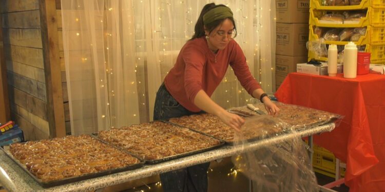 Trenary Toast Cafe partnered with Northern Michigan University to offer free hot chocolate, coffee, NMU swag, and a place to take a break from the cold. The staff also prepared more than a thousand cinnamon rolls for guests.
