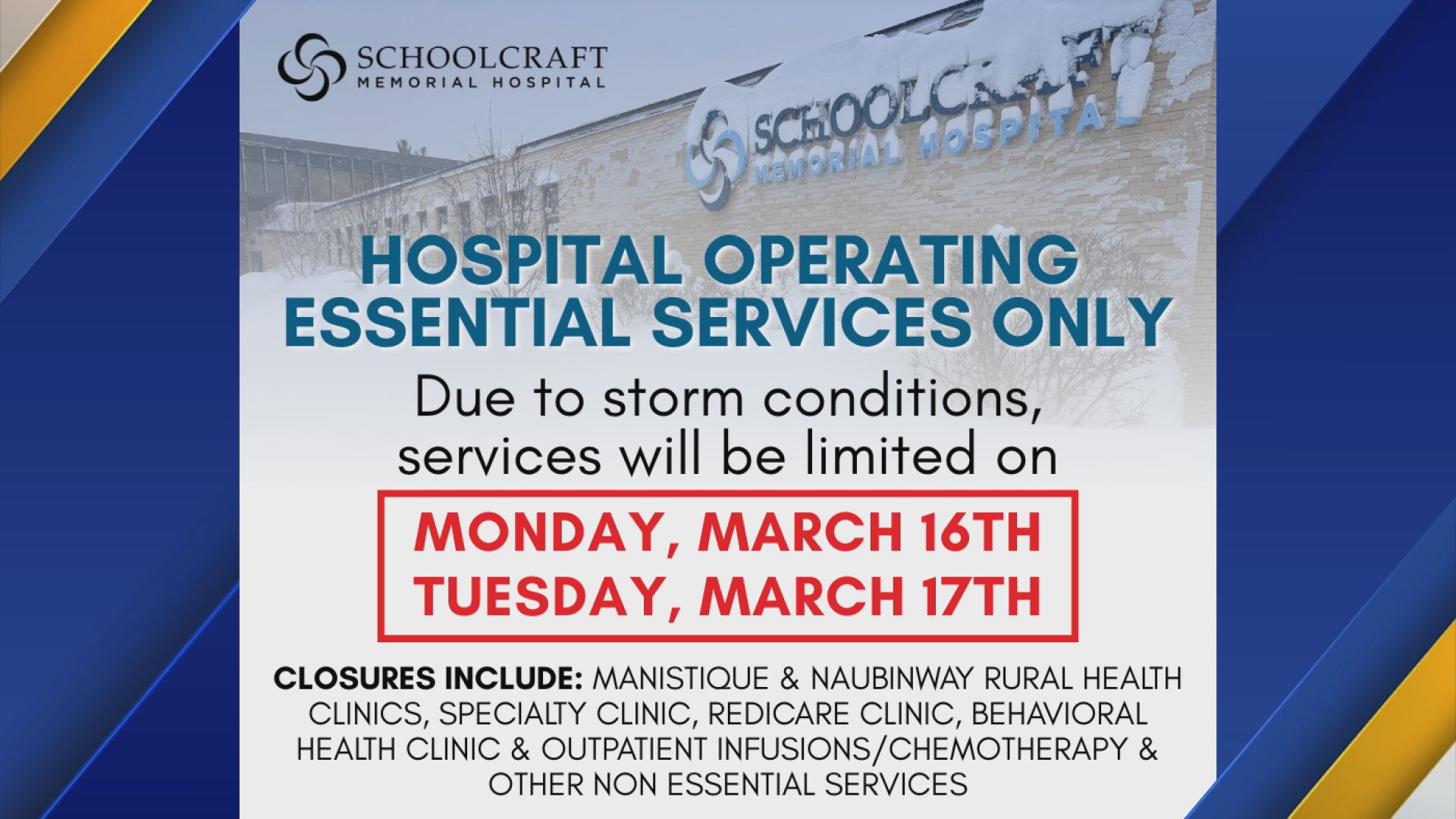 MANISTIQUE, Mich. (WZMQ) – Due to anticipated severe winter weather conditions, Schoolcraft Memorial Hospital will close nonessential services on both Monday, March 16 and Tuesday March 17th, to help ensure the safety of patients, visitors, and staff.