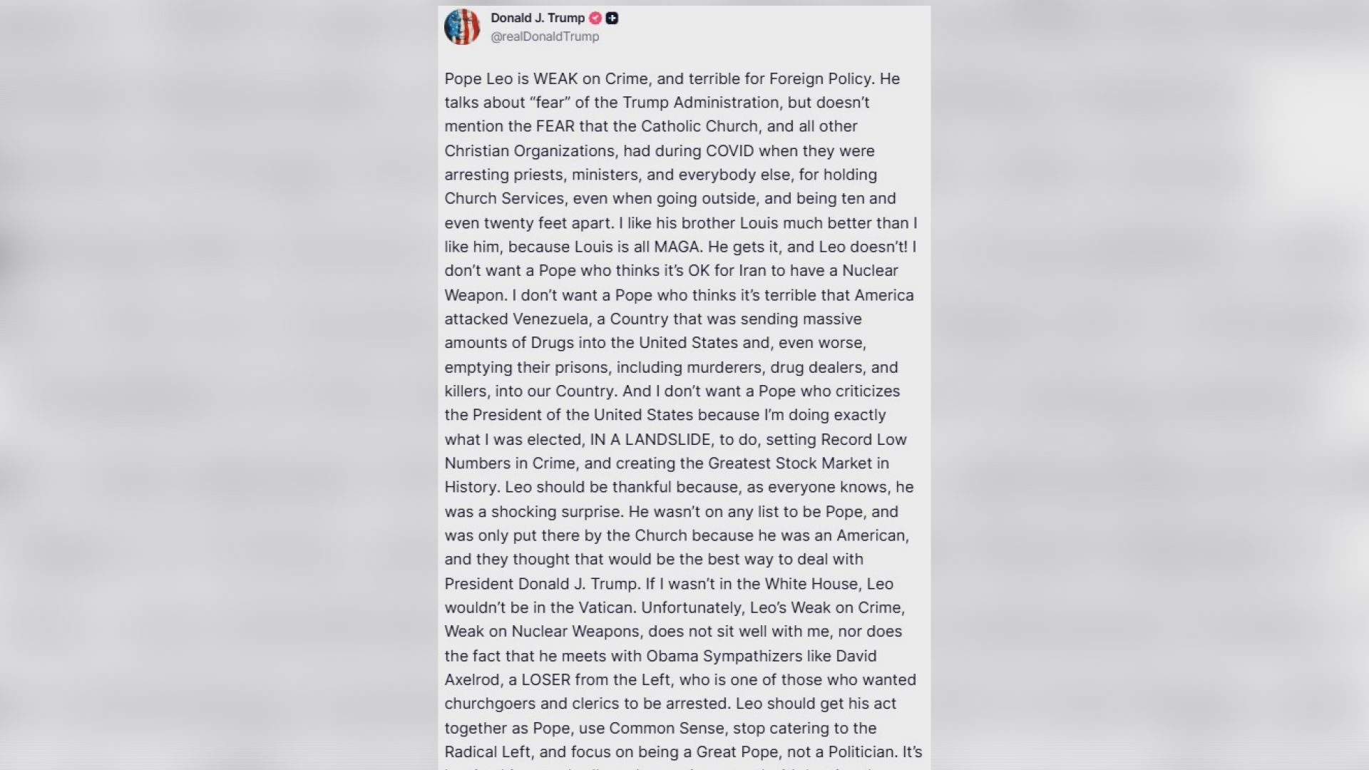 The President, responding to the Pope’s latest comments, shared a lengthy Truth Social post late Sunday night, which said in part: “Pope Leo is WEAK on Crime, and terrible for Foreign Policy…” He adds: “And I don’t want a Pope who criticizes the President of the United States because I’m doing exactly what I was elected, IN A LANDSLIDE, to do…” Trump also claimed that if he wasn’t in the White House, “Leo wouldn’t be in the Vatican.”
