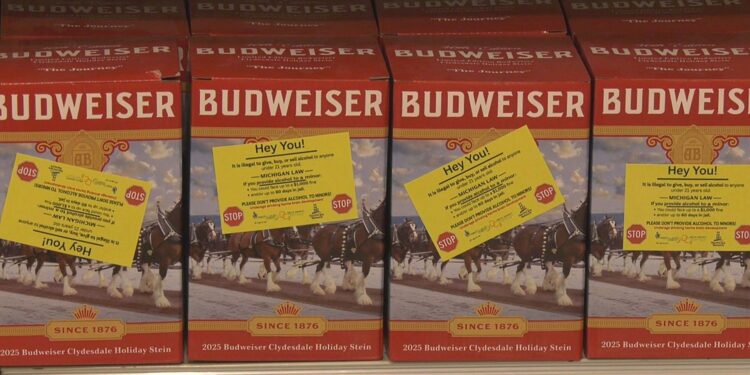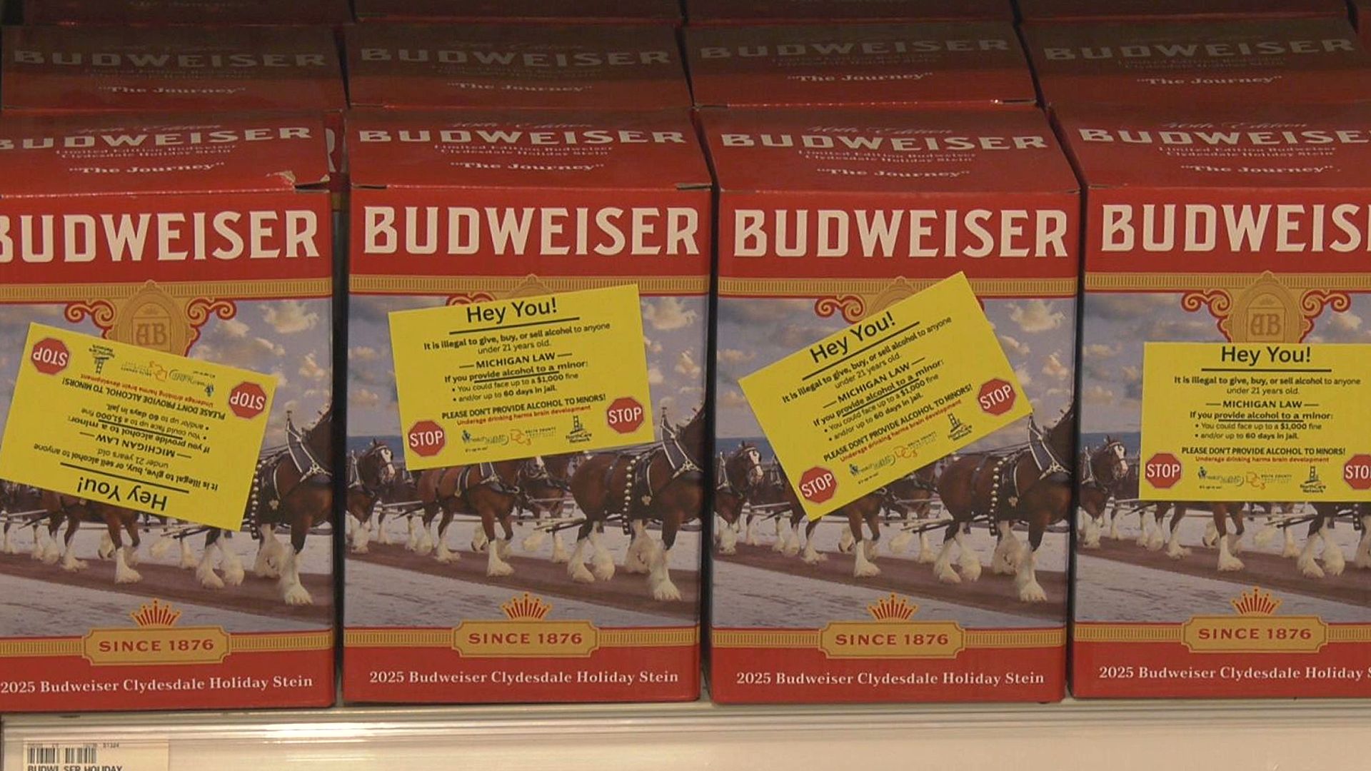In Michigan, giving minors alcohol is punishable by up to $1,000 in fines and/or up to 60 days in jail. The stickers also note that underage drinking can harm development.